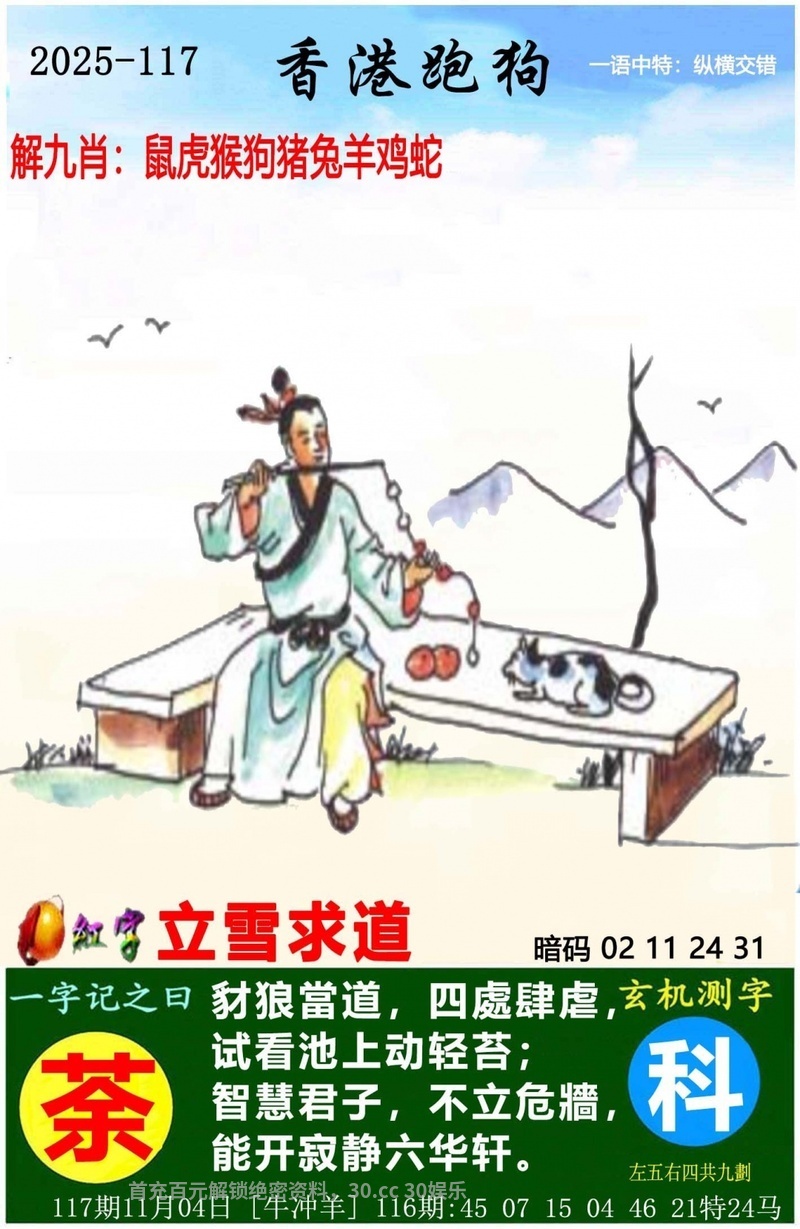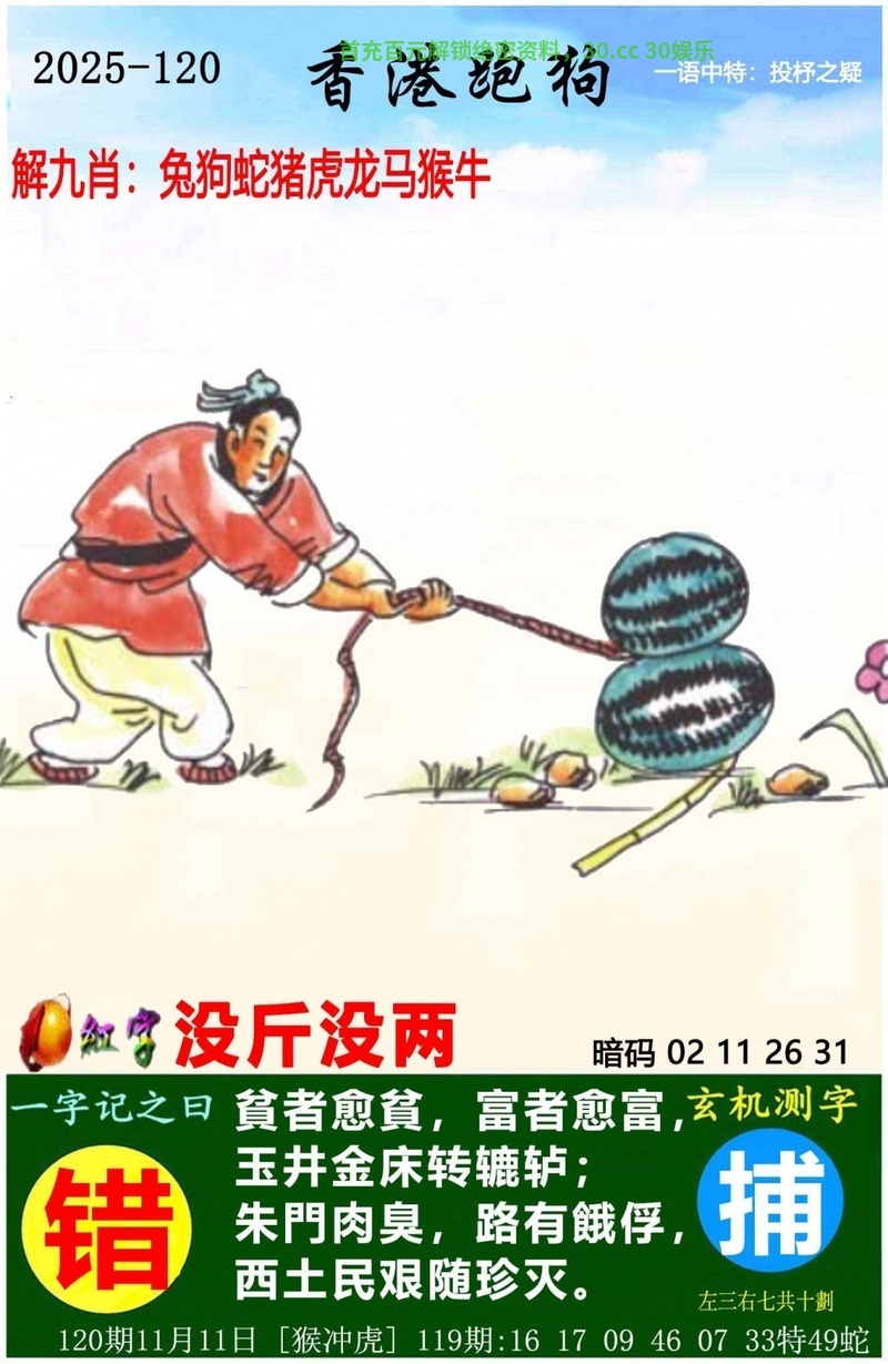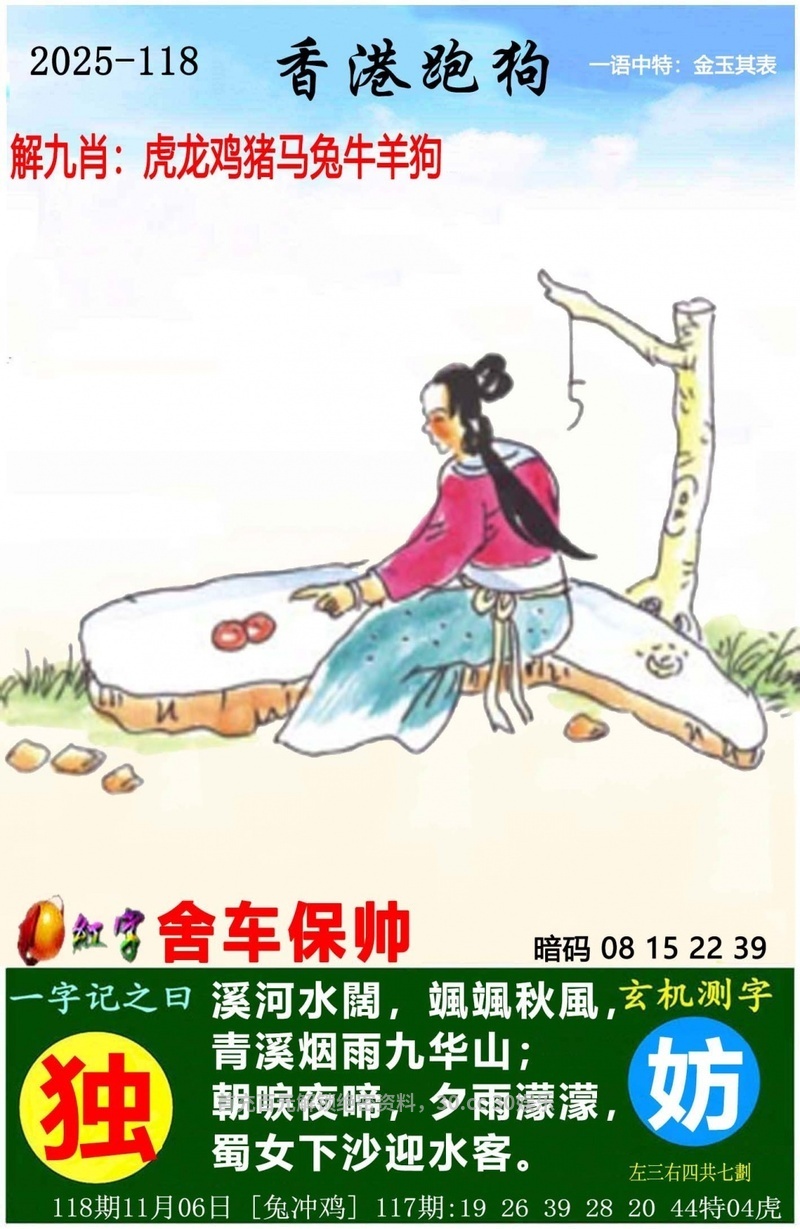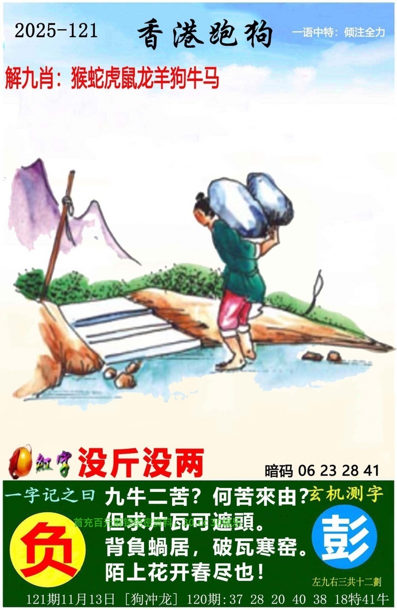 新版跑狗诗 121期:新版跑狗一字記之曰【负】 背負蝸居,破瓦寒窑。 陌上花开春尽也! 玄機測字:《彭》 一語中特:倾注全力 老版跑狗诗 121期老版跑狗一字記之曰:【梦】 詩雲:六幅蒲帆晓渡平,起望东北心滔滔 醉鄉尋夢,猶勝入定。誰教酒醉三分醒? 趨炎附勢,随声逐响。珠光新霭映人来? 玄機測字:《抽》 另版跑狗诗 121期另版跑狗一字記之曰:【落】 自我封閉,躲在角落。無友無敵總寂寞。 不問世事,何須頻撲?渾渾噩噩也安樂。 红字暗码 121期信箱红字:没斤没两 信箱暗码:06 23 28 41 |